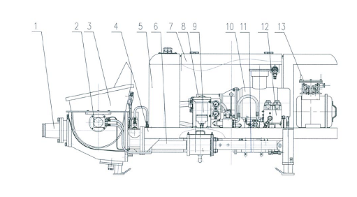 1.出料口 2.攪拌機構 3.料斗 4.機架 5.液壓油箱 6.泵送系統(tǒng) 7.機罩總成 8.潤滑系統(tǒng) 9.動力系統(tǒng) 10.防暴電動機 11.液壓系統(tǒng) 12.水冷卻部件 13.電器總成