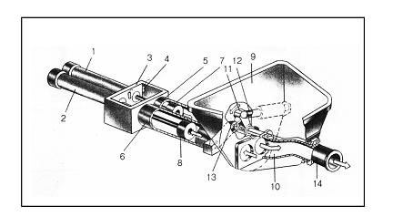 如圖圖所示泵送機構由兩只主油缸(1、2),水箱3,換向裝置4,兩只混凝土缸(5、6),兩只混凝土活塞(7、8),料斗9,分配閥10(又稱S管)擺臂11,兩只擺動油缸(12、13)和出料口14組成。